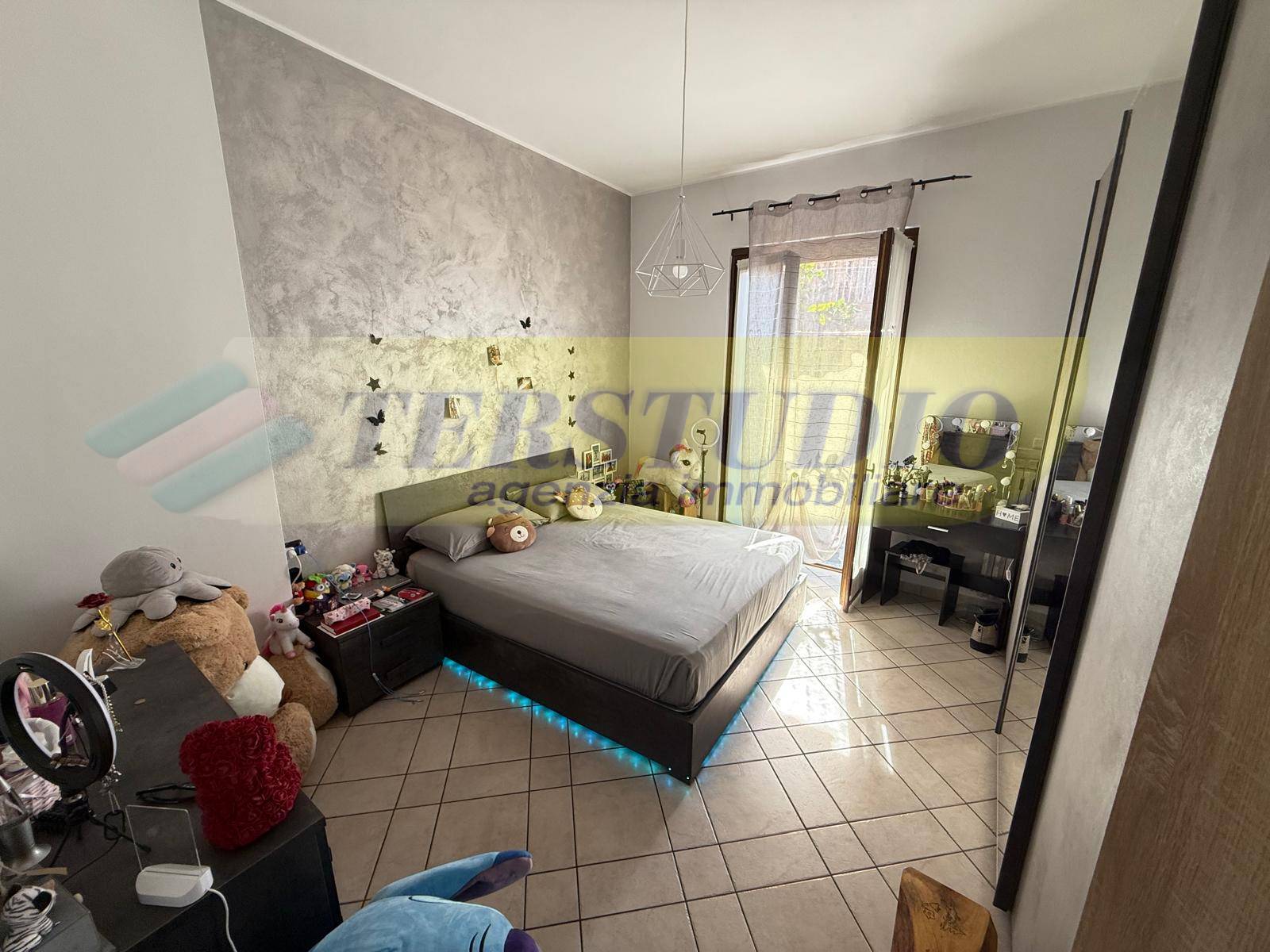 L'abitazione, al piano terra, si compone di un luminoso soggiorno, cucina abitabile, disimpegno, due camere matrimoniali, bagno finestrato con doccia e uno spazio esterno riservato delimitato da fioriere.