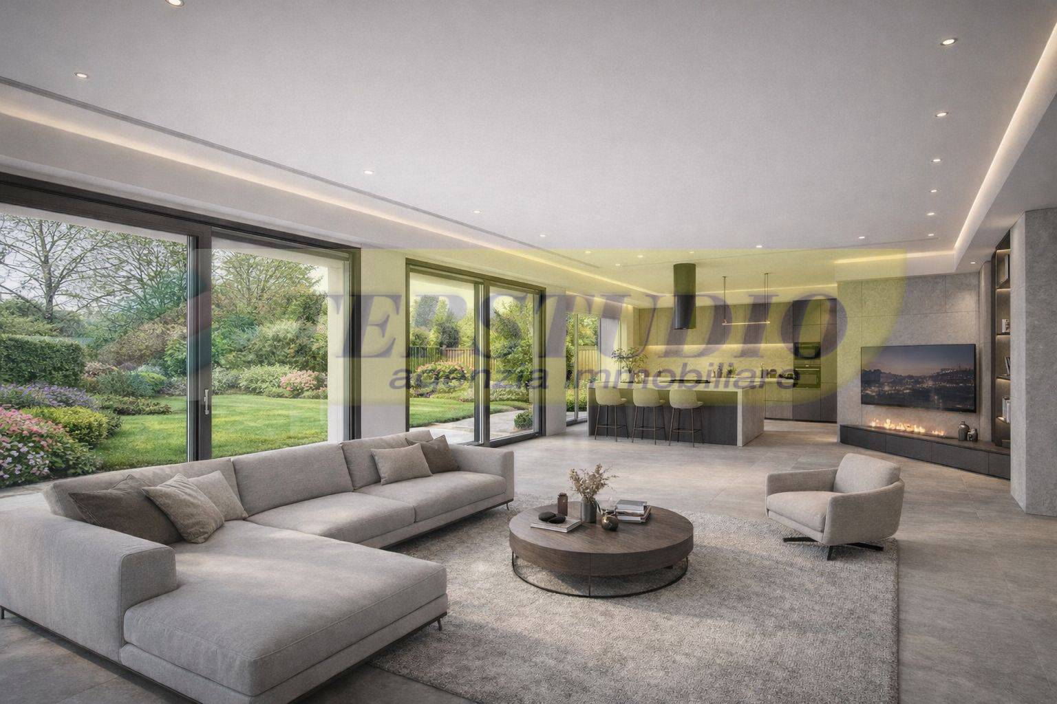 Ingresso indipendente su luminoso open space living con cucina, caratterizzato da spazi armoniosi e funzionali. La zona giorno si affaccia direttamente sul porticato moderno e sull'ampio giardino privato, ideale per vivere l'esterno in totale privacy.